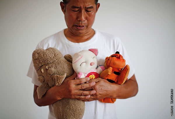 Мужчина держит плюшевые игрушки своей дочери, которая была на борту MH370.