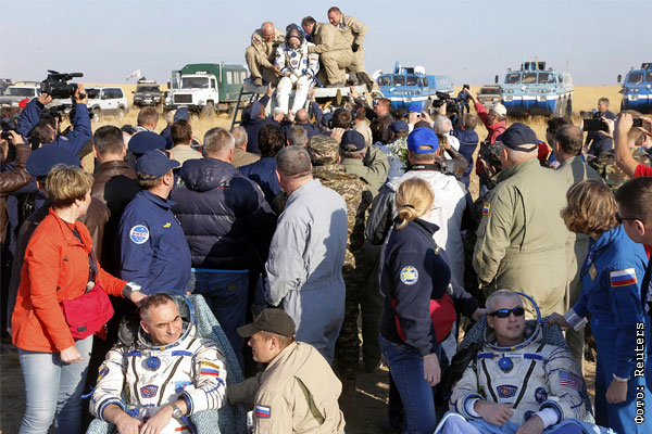 Спускаемый аппарат космического корабля "Союз ТМА-12М" с российскими космонавтами Александром Скворцовым и Олегом Артемьевым, а также американским астронавтом Стивеном Свонсоном успешно приземлился в Казахстане.