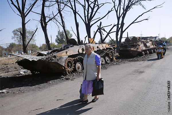 Пожилая женщина проходит мимо украинской военной техники, сгоревшей в результате боевых действий.