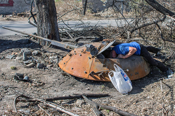 Мужчина заглядывает внутрь бронетранспортера украинской армии.