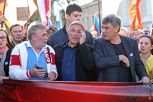 Поэт Андрей Орлов (Орлуша), сопредседатель партии РПР-ПАРНАС Михаил Касьянов и лидер движения "Солидарность" Борис Немцов (слева направо на первом плане) во время акции "Марш мира" в Москве.