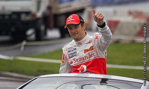 Британский гонщик команды "Макларен" Дженсон Баттон во время показательных заездов болидов "Формулы-1" в рамках автомобильного шоу Moscow City Racing 2011.