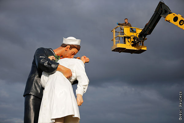 Установка скульптуры Сьюарда Джонсона "Безоговорочная капитуляция" перед канским мемориалом в Нормандии.
