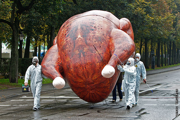 Экологические активисты несут гигантского надувного цыпленка в знак протеста против обработки куриц хлором. Акция проходила недалеко от проведения Октоберфеста в Мюнхене.