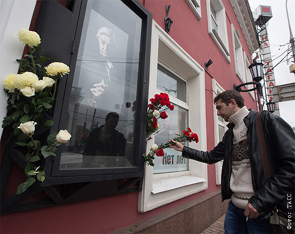 Люди приносят цветы к зданию Театра на Таганке. Основатель Театра на Таганке Юрий Любимов скончался на 98-м году жизни в Москве в Боткинской больнице.
