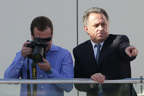 Председатель правительства РФ Дмитрий Медведев и министр спорта Виталий Мутко наблюдают за гонкой.