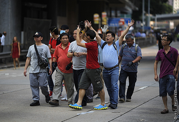 Выступающие против разного рода оккупаев жители города мешают работе фотографа, снимающего продемократических протестующих.