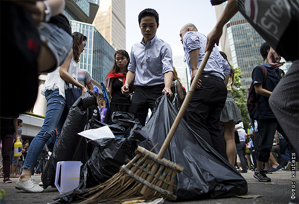 В понедельник сотрудники полиции начали разбирать баррикады в Адмиралтейском районе Гонконга для того, чтобы освободить дороги для движения транспорта.