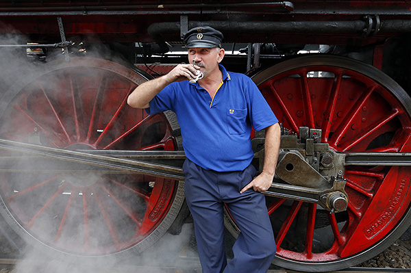 Машинист наслаждается чашечкой кофе перед поездкой.