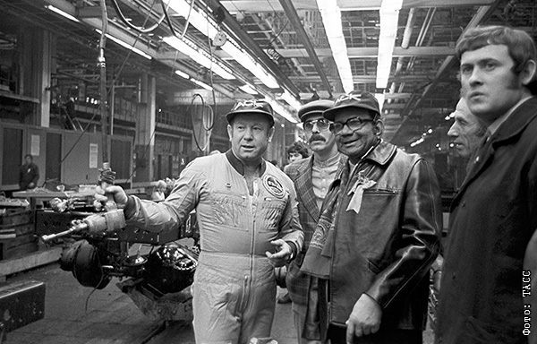 Летчик-космонавт СССР Алексей Леонов (слева) и посол Кубы в СССР Агирре Дель Кристо (в центре) в одном из цехов автозавода ЗИЛ. 1980 год
