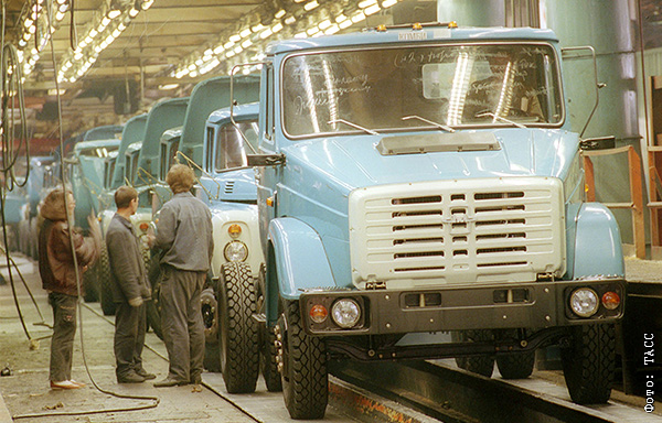 Акционерное московское общество было основано 2 августа 1916 года. Выросший на его базе ЗИЛ в сентябре 1992 года вновь был акционирован. Основная продукция "АМО-ЗИЛ" - грузовики среднего класса с бензиновыми и дизельными двигателями, способные работать при температуре от -50 до +50 градусов, на асфальтобетонных магистралях и грунтовых дорогах. На снимке: главный конвейер "АМО-ЗИЛ", 1993 год