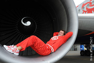 Фигурист Алексей Тихонов во время проводов олимпийской сборной России в аэропорту "Шереметьево-2"
