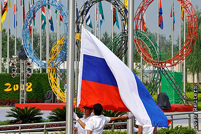 Волейболисты Вадим Хомутских (на втором плане в центре) и Алексей Вербов (справа) во время церемонии поднятия флага РФ в олимпийской деревне