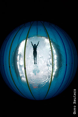 В Пекине в National Aquatics Centre, более известном как "Водный Куб", прошла тренировка пловцов