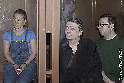 Экс-сотрудники МЭРТ РФ Евгения Сахаровская, Геннадий Ярцев и Андрей Мылов (слева направо) перед вынесением приговора в Мосгорсуде