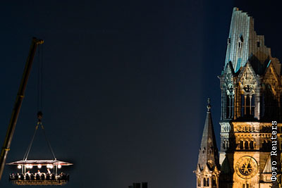 В Берлине появилась новая необычная услуга "Ужин в небе", где ужинающих гостей поднимают краном на значительную высоту над городом