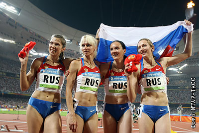 Российские спортсменки Анастасия Капачинская, Юлия Гущина, Людмила Литвинова и Татьяна Фролова (слева направо), завоевавшие серебряную медаль в финале женской эстафеты 4 по 400 метров на Олимпийских играх