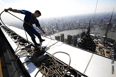 Рабочий на крыше 492-метрового здания Шанхайского Мирового Финансового Центра, которое будет открыто общественности 30 августа