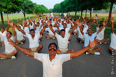 Персонал службы обеспечения безопасности индийского города Аллахабад во время утренней смехотерапии йоги