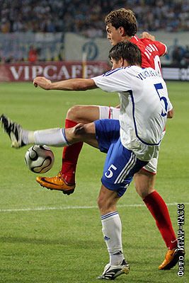 Игроки "Динамо" Огнен Вукоевич (на первом плане) и "Спартака" Артем Дзюба (на втором плане) в матче отборочного раунда Лиги чемпионов "Динамо" (Киев) - "Спартак" (Москва)