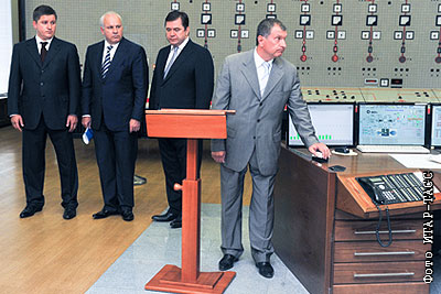 Вице-премьер РФ Игорь Сечин (на первом плане) на церемонии запуска гидроагрегата №4 на центральном пульте управления Саяно-Шушенской ГЭС. На втором плане слева направо - председатель правления ОАО "РусГидро" Евгений Дод, губернатор Хакасии Виктор Зимин и министр энергетики РФ Сергей Шматко