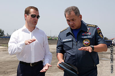 Президент РФ Дмитрий Медведев и глава МЧС РФ Сергей Шойгу перед посещением пожарной части № 35 в Имеретинской долине.