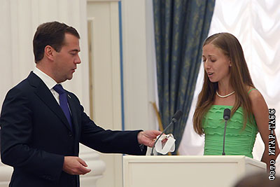 Президент РФ Дмитрий Медведев и двукратная чемпионка мира по спортивной ходьбе Ольга Каниськина, выигравшая золото на чемпионате Европы по легкой атлетике в Барселоне, во время встречи в Кремле