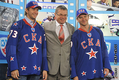 Вратарь Евгений Набоков, председатель совета директоров ХК СКА и президент Континентальной хоккейной лиги (КХЛ) Александр Медведев и защитник Денис Гребешков (слева направо) на пресс-конференции, посвященной подписанию контракта Е.Набокова и Д.Гребешкова с хоккейным клубом СКА