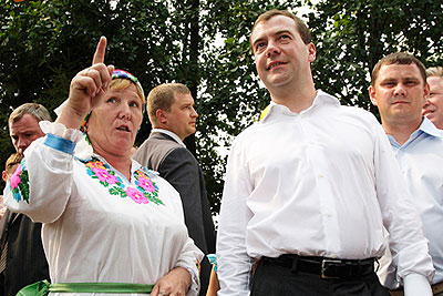Президент России Дмитрий Медведев во время общения с жителями и фермерами в деревне Малый Шаплак