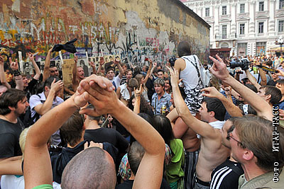 Поклонники группы "Кино" у стены Виктора Цоя на Старом Арбате в день 20-й годовщины гибели музыканта
