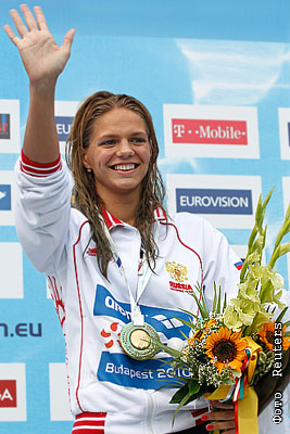 Россиянка Юлия Ефимова, выигравшая золотую медаль Чемпионата Европы по плаванию на дистанции 50 м брассом, в Будапеште