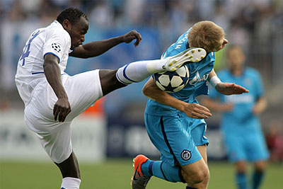 Игроки "Осера" Деннис Ольеч и "Зенита" Томаш Губочан (слева направо) в отборочном матче лиги чемпионов по футболу: "Зенит" (Россия) – "Осер" (Франция) - 1:0