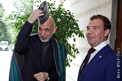 Президенты Афганистана и России Хамид Карзай и Дмитрий Медведев во время встречи в резиденции "Бочаров ручей"
