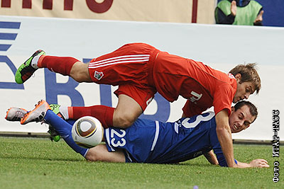 Игроки "Локомотива" Руслан Камболов (сверху) и "Динамо" Люк Уилкшир в матче чемпионата России по футболу: "Динамо" (Москва) - "Локомотив" (Москва)
