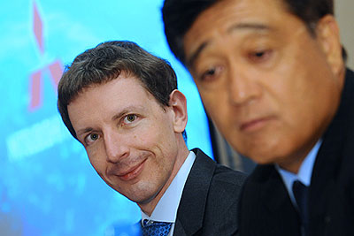 Главный исполнительный директор ООО "Рольф Импорт" Андрей Панков и президент Mitsubishi Motors Corporation Осаму Масуко (слева направо) во время пресс-конференции, посвященной Московскому Международному автомобильному салону 2010. Компания "Рольф Импорт" является официальным дистрибьютором марки Mitsubishi в России