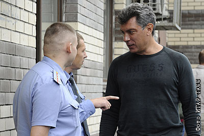 Сопредседатель движения "Солидарность" Борис Немцов у Пресненского районного суда, где было рассмотрено его дело по обвинению в "неповиновении законному распоряжению сотрудника милиции". Б. Немцов был задержан на Новом Арбате за попытку пройти по улице с российским флагом