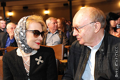 Актеры Рената Литвинова и Андрей Мягков во время сбора труппы театра МХТ им. А.П.Чехова