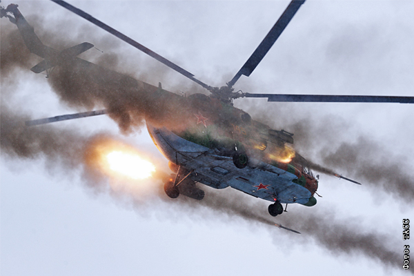 Транспортно-штурмовой вертолет МИ-8АМТШ во время демонстрационных показов.
