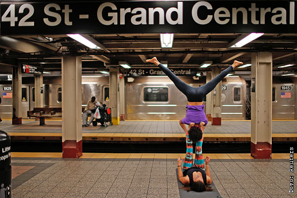 Акройога в Нью-Йоркском метро.