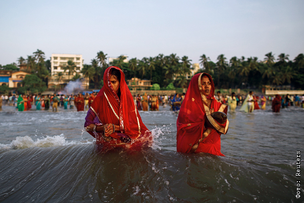 Индийские женщины во время молитвы заходящему Солнцу в Мумбаи.
