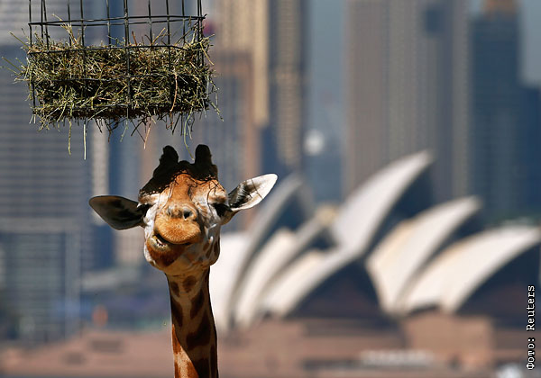 Жираф во время кормления в сиднейском зоопарке Таронга.