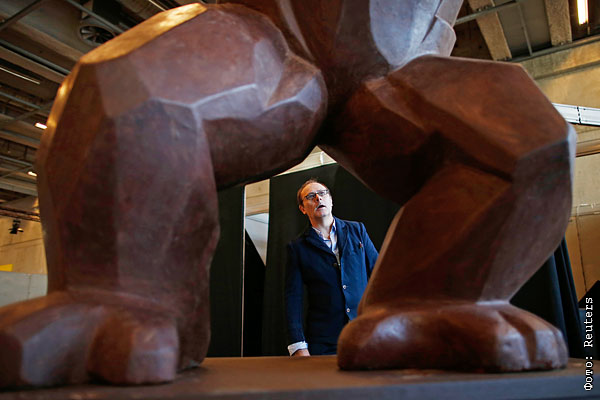 Французский шоколатье Жан-Поль Эвин смотрит на четырехметрового Кинг-Конга, созданного для 20-го Парижского Салона Шоколада.