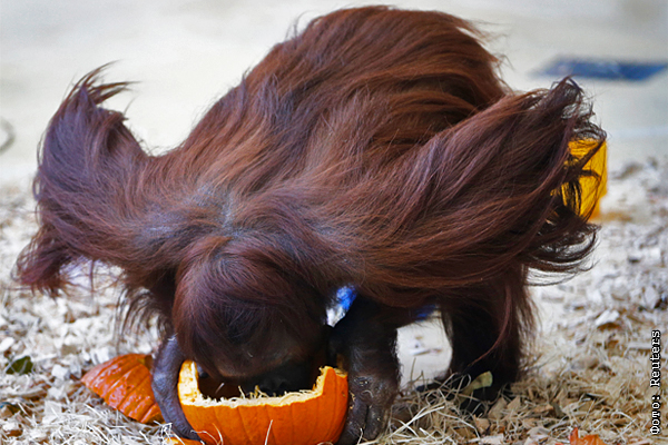 Орангутанг пьет воду из тыквы во время завтрака в канун Хэллоуина в Шёнбруннском зоопарке в Вене.