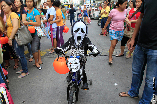 Школьник в маске и костюме перед началом празднования Хэллоуина в Маниле.