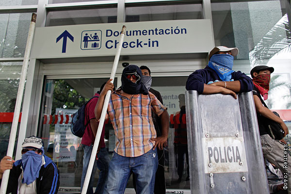 Протестующие блокируют вход в здание аэропорта в Акапулько.