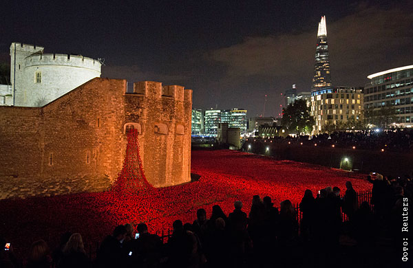 11 ноября — в день окончания Первой мировой войны - у Лондонского Тауэра был "посажен" последний из красных керамических маков в память о погибших в этом военном конфликте солдатах Британской империи. Красные цветы являются главными элементами инсталляции "Кровь обагрила земли и моря" (Blood Swept Lands and Seas of Red), которую силами волонтеров начали устанавливать в июле, а открыли в августе.