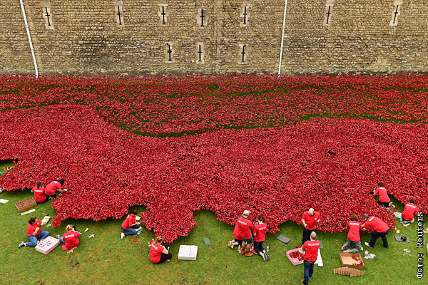 11 ноября — в день окончания Первой мировой войны - у Лондонского Тауэра был "посажен" последний из красных керамических маков в память о погибших в этом военном конфликте солдатах Британской империи. Красные цветы являются главными элементами инсталляции "Кровь обагрила земли и моря" (Blood Swept Lands and Seas of Red), которую силами волонтеров начали устанавливать в июле, а открыли в августе.