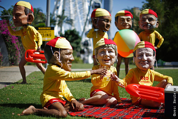 Демонстранты в масках лидеров G20 и в форме австралийских пляжных спасателей в преддверии саммита в Брисбене.
