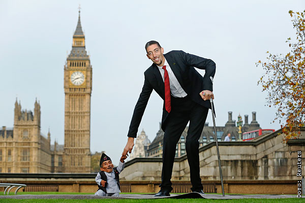 Самый низкий и самый высокий человек на планете приветствуют друг друга на празднике в честь Всемирного дня рекордов Гиннесса в Лондоне.