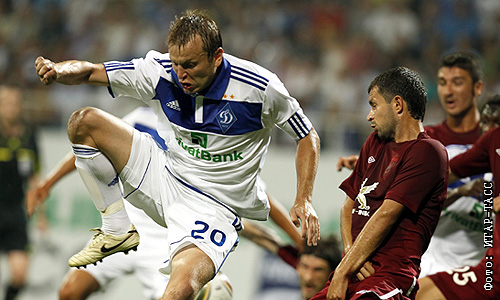 Игроки "Динамо" Олег Гусев и "Рубина" Сергей Кисляк (слева направо) во время первого матча третьего отборочного раунда Лиги чемпионов УЕФА: "Динамо" (Киев, Украина) - "Рубин" (Казань, Россия) - 0:2.